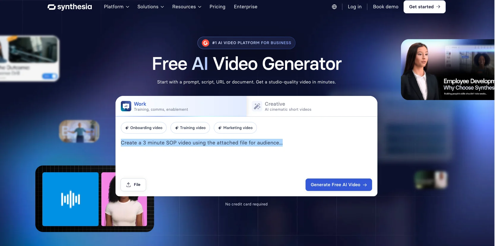 Synthesia is the video SOP software used by enterprise teams across manufacturing, healthcare, financial services, and IT. It accepts input from PDFs, PowerPoints, Word documents, and URLs, and outputs MP4, SCORM, embeds, and shareable links.